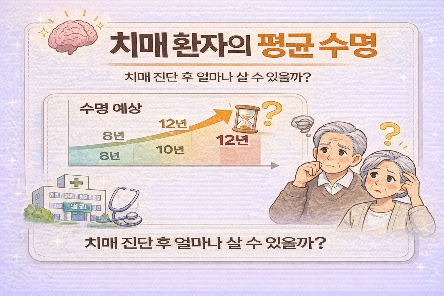 치매 진단을 받으면 많은 가족들이 가장 먼저 궁금해하는 것이 치매 환자의 평균 수명입니다. 하지만 치매는 개인의 건강 상태, 치매 종류, 치료 여부 등에 따라 차이가 있기 때문에 정확한 기간을 단정하기는 어렵습니다. 다만 여러 연구 결과를 보면 평균적인 경향은 어느 정도 알려져 있습니다.